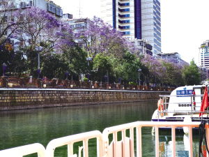 盤龍江桃源廣場至江濱西路這一段,景色怡人,江邊的藍(lán)花楹尤其惹人喜愛,不時(shí)有市民停留拍照。