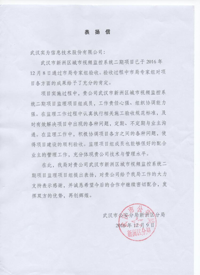 實(shí)為公司獲得武漢市公安局新洲區(qū)分局表揚(yáng)