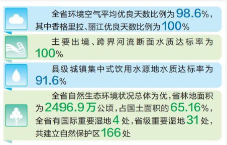 全省環(huán)境空氣質(zhì)量總體保持良好,16個(gè)地級(jí)城市環(huán)境空氣質(zhì)量指標(biāo)年平均值連續(xù)5年達(dá)到《環(huán)境空氣質(zhì)量標(biāo)準(zhǔn)》(GB3095—2012)二級(jí)標(biāo)準(zhǔn);從優(yōu)良天數(shù)來看,全省平均優(yōu)良天數(shù)比例為98.6%,其中香格里拉、麗江優(yōu)良天數(shù)比例為100%。