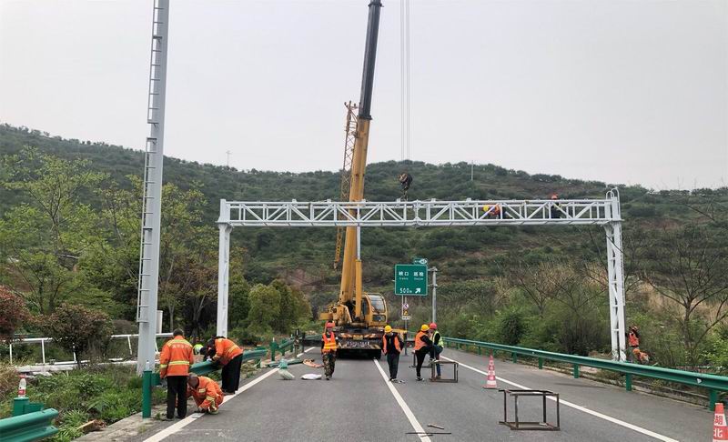 圖為 呼北、麻安高速襄陽段區(qū)間測速項目龍門架吊裝施工現(xiàn)場 旁站
