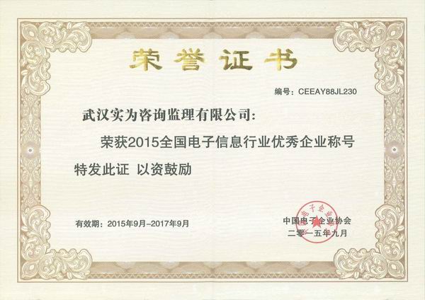 熱烈慶祝武漢實為咨詢監(jiān)理公司榮獲2015年全國電子信息行業(yè)優(yōu)秀企業(yè)。我公司為湖北唯一當選的信息系統(tǒng)咨詢監(jiān)理服務(wù)機構(gòu)。希望各位同事百尺竿頭更上一樓,不斷突破自我、追求卓越,成為全國領(lǐng)先的一流的信息技術(shù)服務(wù)機構(gòu)。