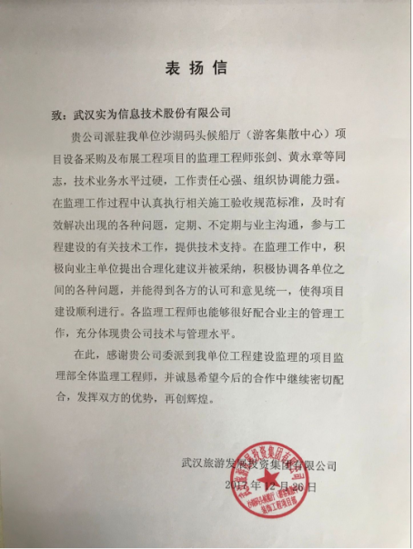 實為公司員工通過自身的業(yè)務水平、責任心、組織協(xié)調(diào)能力在沙湖碼頭候船廳(游客集散中心)項目中獲得業(yè)主單位好評,并獲得各方認可。實為公司會一直秉承實為理念,傳遞認真負責的工作態(tài)度,更好的為各項目提供服務,獻計獻策。