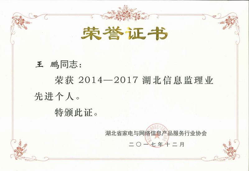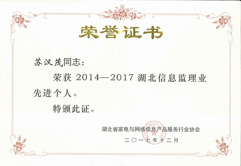 根據(jù)湖北省家電與網(wǎng)絡(luò)信息產(chǎn)品服務(wù)行業(yè)協(xié)會2017年12月15日發(fā)布的《關(guān)于開展2014-2017年優(yōu)秀單位及先進(jìn)個人評選活動的通知》,公司積極參與協(xié)會活動,經(jīng)協(xié)會會長辦公會審核決定,咨詢部負(fù)責(zé)人蘇漢茂、平安城市事業(yè)部負(fù)責(zé)人王鵬被評為“湖北信息監(jiān)理先進(jìn)個人”。