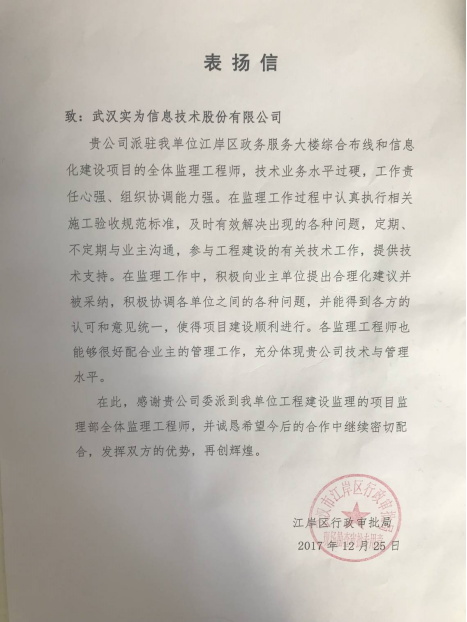 實為公司員工通過自身的業(yè)務(wù)水平、責(zé)任心、組織協(xié)調(diào)能力在江岸區(qū)政務(wù)服務(wù)大樓綜合布線和信息化建設(shè)項目中獲得業(yè)主單位好評,并獲得各方認(rèn)可。實為公司會一直秉承實為理念,傳遞認(rèn)真負(fù)責(zé)的工作態(tài)度,更好的為各項目提供服務(wù),獻(xiàn)計獻(xiàn)策。