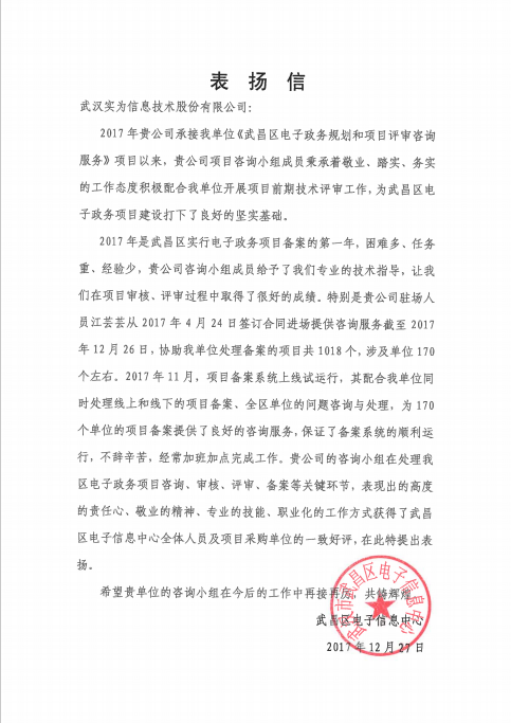 實為公司員工通過自身的業(yè)務(wù)水平、責(zé)任心、積極地工作態(tài)度,在武昌區(qū)電子政務(wù)規(guī)劃和項目評審咨詢項目中為項目提供技術(shù)指導(dǎo)并獲得業(yè)主單位好評,并獲得各方認(rèn)可。實為公司會一直秉承實為理念,傳遞認(rèn)真負(fù)責(zé)的工作態(tài)度,更好的為各項目提供服務(wù),獻(xiàn)計獻(xiàn)策。
